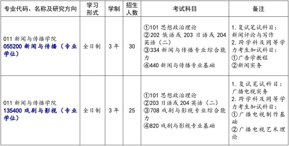 2026年我院拟招收硕士研究生55人,其中新闻与传播专业硕士30人,戏剧与影视专业硕士25人,(学校按照正式下达的招生计划开展录取工作,根据各专业生源情况、初试成绩等因素进行适当调整)。实际招收推免生人数以“全国推荐免试攻读研究生信息公开暨管理服务系统”确认录取人数为准。