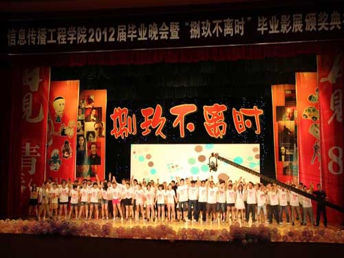 信息传播工程学院讯(通讯员 韩美华)又是一年毕业季,又是一年离别时。2012年6月20日晚6:30,信息传播工程学院在我校南湖校区大学生活动中心隆重举办2012届毕业晚会暨“捌玖不离时”毕业影展颁奖典礼。参加本次典礼的学校各部门领导有成人影视片