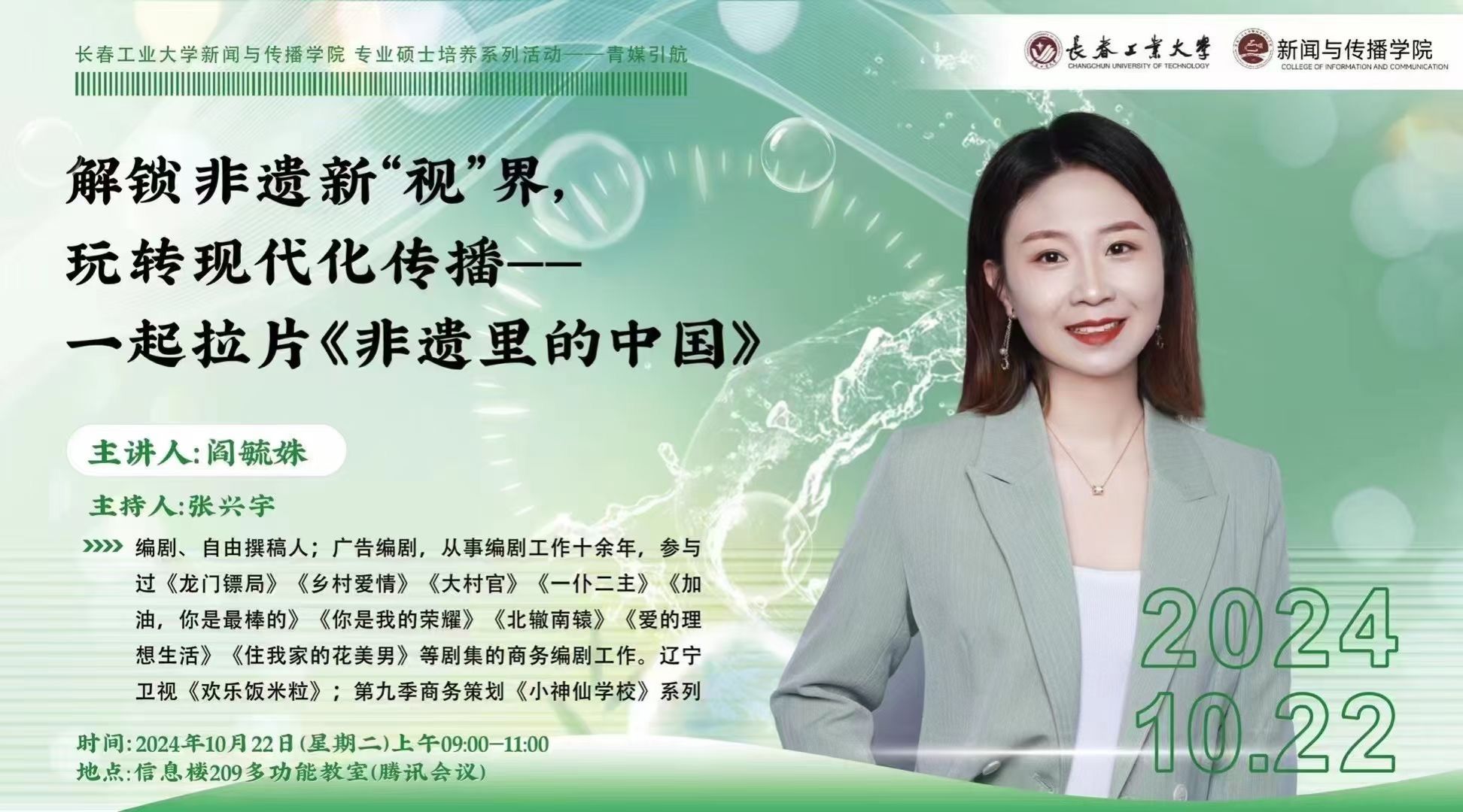 邀请到编剧、自由撰稿人阎毓姝,开展了题为《解锁非遗新“视”界 玩转现代化传播》专题讲座。该讲座由我院广播电视编导专业教师张兴宇主持,我院2024级广播电视、新闻与传播专业全体硕士研究生参与了此次讲座。