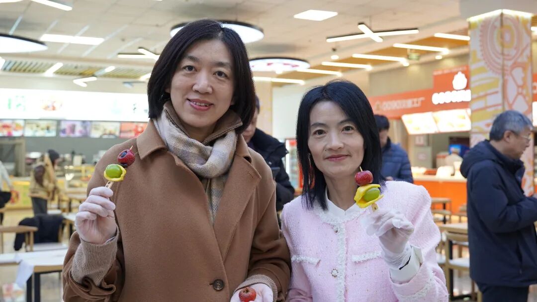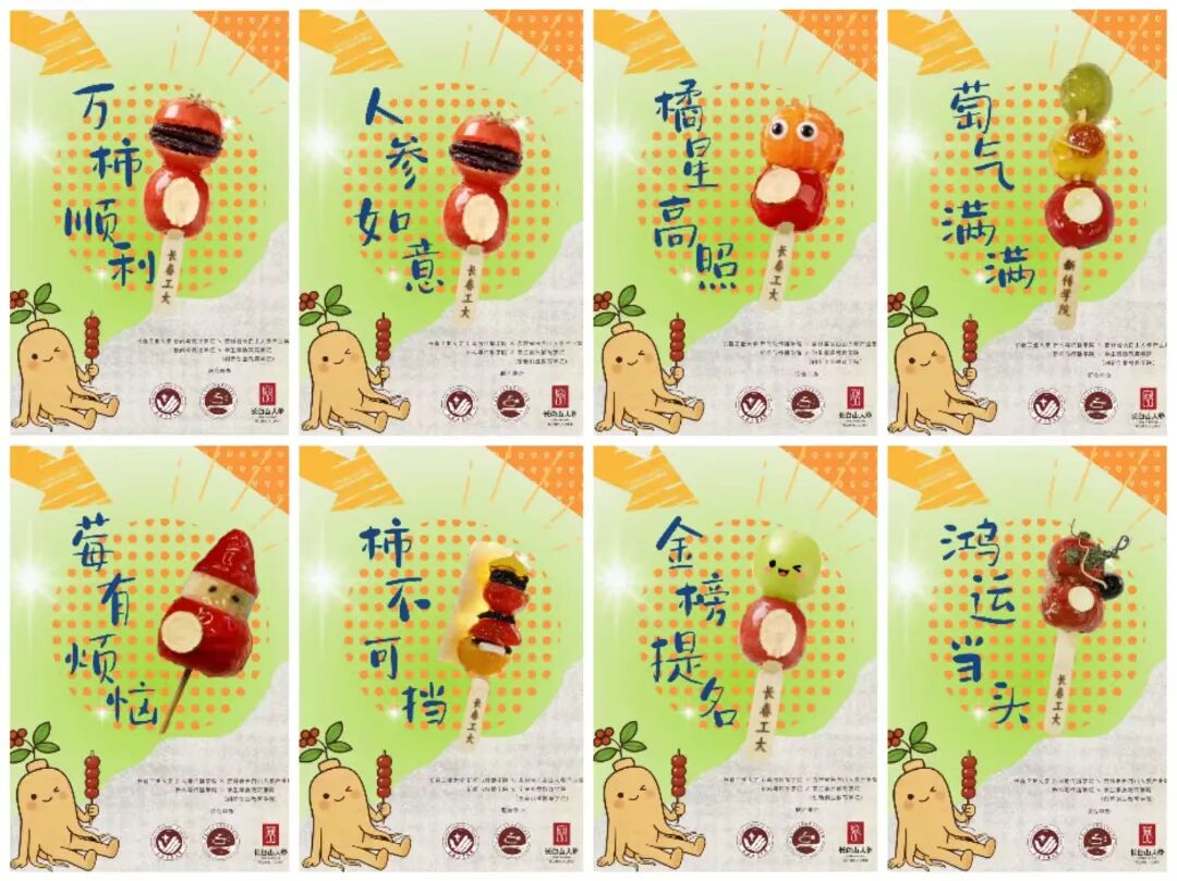 的师生们化身“文创匠人”,从食材甄选到造型设计全程亲力亲为。精选颗粒饱满的本地山楂,搭配营养价值丰富的长白山人参,经过去核、串制、熬糖、裹衣等多道工序,别出心裁的与人参蜜片、人参冻干片、人参花、人参粉、人参须等进行创意结合,制作出造型别致、酸甜可口的人参糖葫芦(人参如意)。除经典原味外,现场还推出了晴王葡萄(金榜题名)、丹东草莓(莓有烦恼)、圣女果(万柿如意)、砂糖橘(橘星高照)、奶皮子等创新口味,这些口味不仅满足了不同师生的味蕾需求,更饱含着学院对广大师生特别是即将踏上征途的考研同学们的真挚祝福。更有师生发挥专业特长,在糖葫芦包装上融入成人影视片