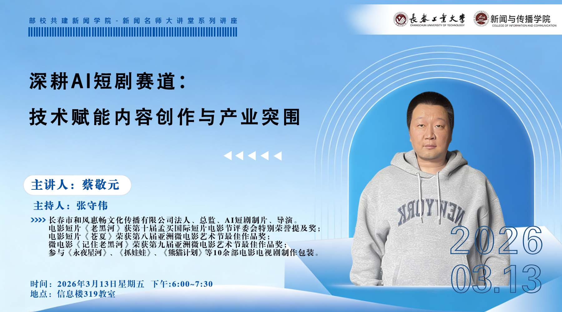 本网讯(通讯员朱嘉琪)2026年3月13日,下午我院成功举办了“深耕AI短剧赛道:技术赋能内容创作与产业突围”专题讲座。本次讲座由成人影视片
